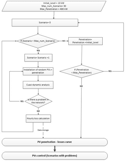 For this purpose, in each level of penetration (10 kW, 20 kW…) until the maximum is reached (Max_Penetration), 30 scenarios are carried out in which Monte Carlo distributed generation is installed, that is, for each level of penetration 30 different scenarios will be obtained. For each of these scenarios a quasi-dynamic study (load flow for each hour) is carried out, allowing to obtain the value of the losses.