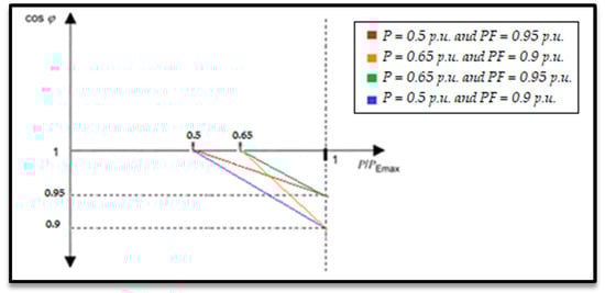 - Power factor control depending on the active power generated (PF = f(P)) [26]: PVs consume reactive power as a function of the active power generated at each moment. In this case the power factor depends on the active power generation. For this control strategy, two parameters are defined: (1) the minimum active power, that indicates which is the value where reactive power consumption starts; (2) the minimum value of the power factor.Figure 2 shows the PF variation curve used to set control strategies such as: