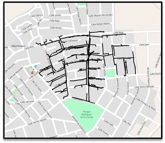 In order to test this methodology, a network model has been developed in PowerFactory DIgSILENT. A real model provided by Grupo Cuerva has been chosen, this real model is a district of a rural town. This model contains 266 consumers, from which 45 have a three-phase connection and 221 single-phase. The total installed power of all customer is 1, 320 MW approximately. This network is divided in 11 feeders (Figure A1 in Appendix A, each of the feeders is indicated in different colours) which have different lengths and different numbers of consumers. Figure 3 shows the LV network topology (More information about the network topology in Appendix A).