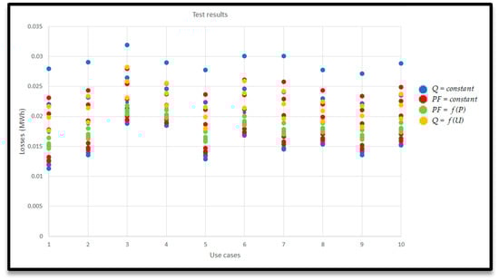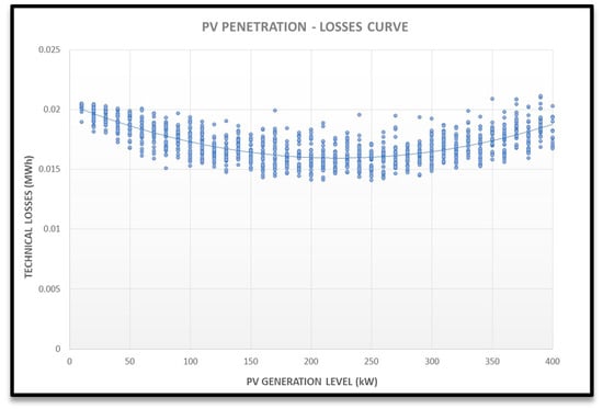 If no problems are detected, total losses are calculated and stored for each of the 24 h. Once there are 30 valid scenarios, the penetration of PVs is increased (Penetration = Penetration + 10 kW) until the maximum penetration is reached (Max_Penetration). After that, the curve “PV penetration-losses” is obtained. Finally, the optimal PV penetration level is derived from the minimum of the PV penetration-loss curve. According to the model definition, network losses decrease with increasing PV penetration until a certain level, where losses start to increase again.