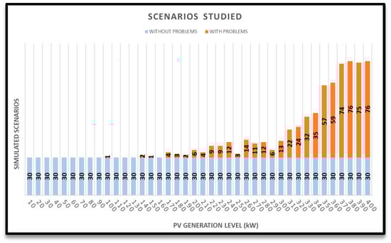 As it can be seen in Figure 5, as distributed PV generation increases, more scenarios were found with problems of voltage deviations, which complicated the finding of the 30 scenarios without voltage deviations. For example, in the scenario with a penetration of 240 kW of distributed PV, 12 scenarios with grid problems have been obtained, this means that to find 30 scenarios without problems, 42 scenarios had to be analysed.