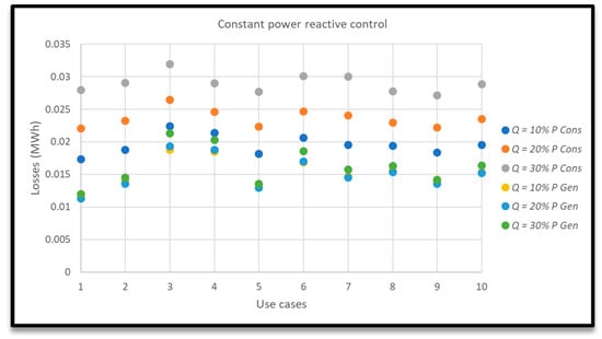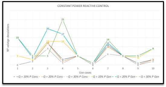 - Constant power reactive control (Q = constant): PVs consume or generate reactive power regardless of the active power installed. An amount of reactive power to be consumed or generated must be set. In order to evaluate efficiently this control strategy, six different values for Q are studied: