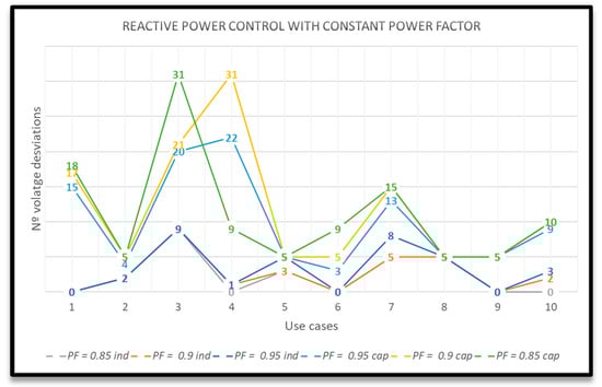 - Reactive power control with constant power factor (PF = constant): The power factor of PVs is set as a constant. To evaluate this control strategy, six PF values are considered indicating if it has inductive or capacitive characteristic (to consume or to generate, respectively):