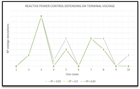 In Reference [23], a reactive power control is implemented in PV inverters managing reactive power according to voltage in the grid connection point. It also reduces the active power generation if the reactive power consumption does not produce the desired decrease in terminal voltage. Reference [24] proposes three reactive power controls in order to reduce overvoltage, two of them based on reactive power management depending on active power generated, Q(P) and the other to grid voltage, Q(U).