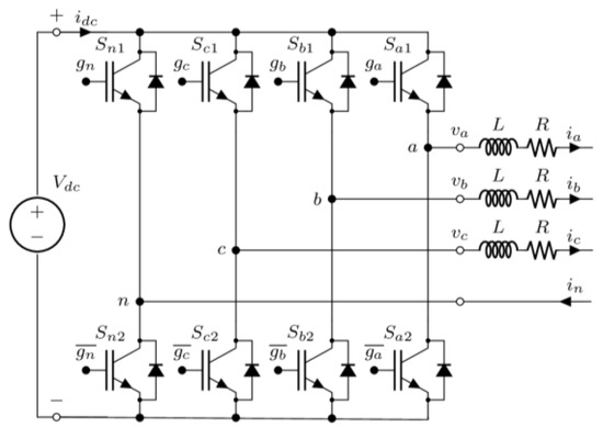 The capability to handle neutral current is gaining interest in grid-connected power applications such as distributed generation systems [1,2], active rectifiers [3,4], and power filters [5]. Particular attention to this feature has been drawn by developing a new generation of electric vehicle (EV) charging infrastructures that are moving towards smart services known as vehicle-to-grid (V2G) and vehicle-for-grid (V4G), where four wire front-end solutions are widely adopted [6]. Among the multiple topologies available in the literature/market, three topologies are commonly utilized: split-capacitor [7,8], four-leg [6,9], and independently controlled neutral module [10]. These voltage source inverters (VSIs) can either have or do not have a neutral inductor in the fourth wire.