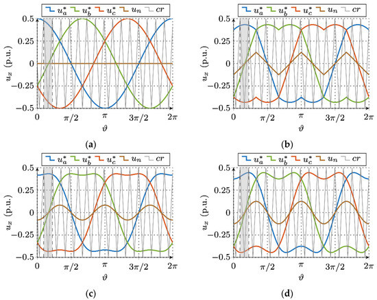 Phase (u*) and neutral (un) modulating signals (at m = 0.5) of: (a) SPWM; (b) CPWM; (c) THIPWM1/6; and (d) THIPWM1/4.