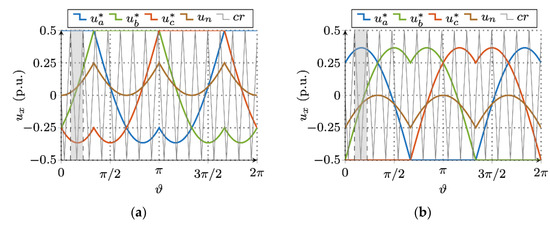 Both DPWMMAX and DPWMMIN are depicted in Figure 3. It is visible that, for one-third of the fundamental period, modulating signals u* do not intersect the carrier cr and therefore do not cause commutations.