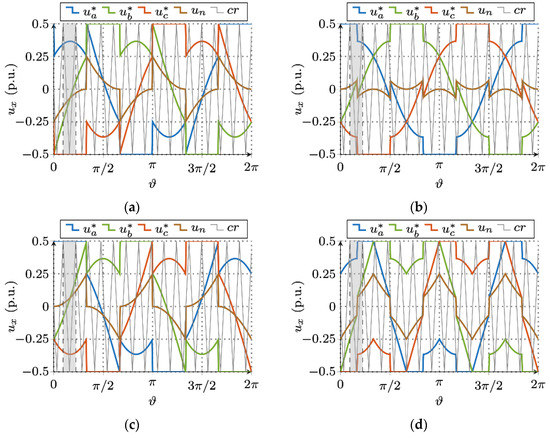 Phase (u*) and neutral (un) modulating signals for: (a) DPWM0; (b) DPWM1; (c) DPWM2; and (d) DPWM3.