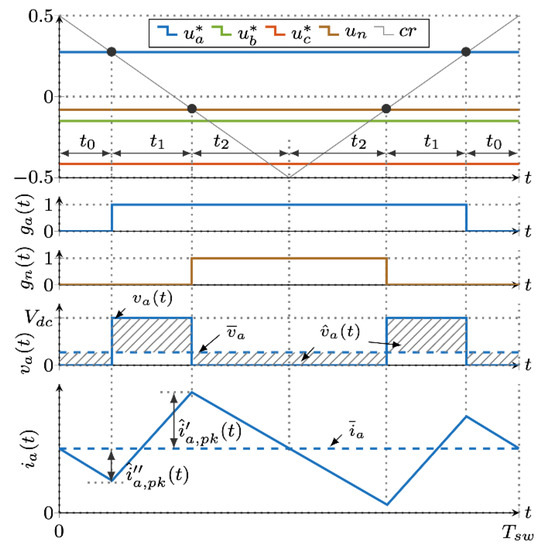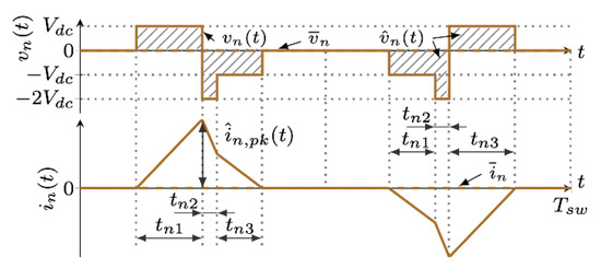 By considering one switching period of a generic injection, the ac current ripple and the voltage pulse disposition could be depicted as in Figure 5. The pulse arrangement employed in this section should be considered valid only for u ≥ 0, namely in case of phase a from −π/2 to π/2. As already thoroughly discussed in the previous sections, due to symmetry reasons, it is possible to restrict the analysis to half of a fundamental period by adopting the assumption above. All the findings shown in this section can be extended to the other phases.
