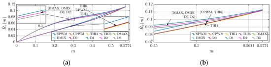 (a) Phase currents with primary (black) and secondary (gray) envelopes in case of THIPWM1/4 (m = 6√3/(7√7)); (b) Phase current ripple rms in case of THIPWM1/4.