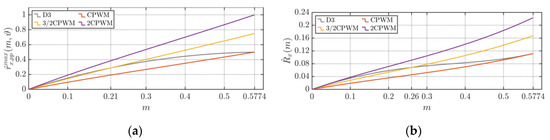 (a) Phase currents with primary (black) and secondary (gray) envelopes in case of DPWM3 (m = 1/√3); (b) Phase current ripple rms in case of DPWM3.