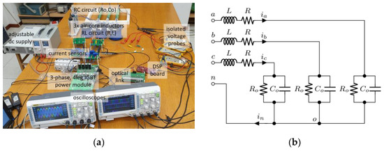 Overall the setup is made out of a four-leg VSI, employing two standard three-phase insulated-gate bipolar transistor (IGBT) power modules (PS22A76, 1200V, 25A, Mitsubishi Electric Corporation, Tokyo, Japan) and supplied by an adjustable dc supply (GEN100-33, 100V, 33A, TDK-Lambda Corporation, Tokyo, Japan). The series RL circuit is made of three magnetically independent air-core inductors. Meanwhile, the RC circuit utilizes a parallel connection of an ac capacitor and a resistor for each of the three phases. Circuital parameters are summarized in Table 2. The switching frequency that has been used in the experiments was selected so low on purpose to display ripple profiles more evidently. Phase and neutral currents are sensed by mean of Hall effect-based current transducers (LA 55-P, 55A, LEM Europe GmbH, Fribourg, Switzerland). Phase voltages are measured through differential isolated voltage probes (PICO TS057, Tyler, TX, USA). The VSI is driven by the digital signal processor (DSP) board (TMS320 F28379D, Texas Instruments, Dallas, TX, USA) via decoupling optical links. The DSP software is deployed via MATLAB/Simulink (MathWorks, Natick, MA, USA) platform in external mode, ensuring the real-time control of all the variables. The experimental datapoints were acquired using two digital oscilloscopes (DS1054Z, Rigol, Beijing, China) at a sampling rate of 5 MHz (without filtering action) and post-processed (plotted) via MATLAB.