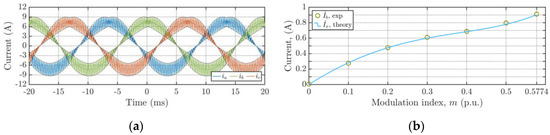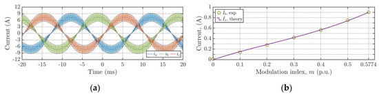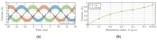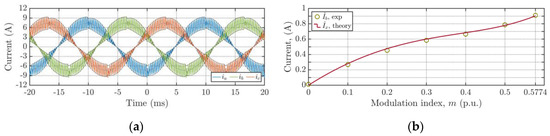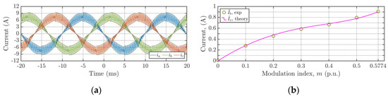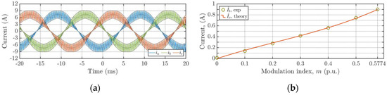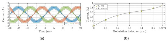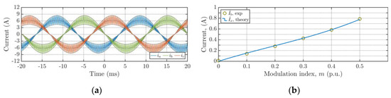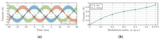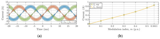 From Figure 33, Figure 34, Figure 35, Figure 36, Figure 37, Figure 38, Figure 39, Figure 40, Figure 41 and Figure 42, experimental phase currents, and the corresponding current ripple rms has been displayed. Subfigures labeled as “(a)” represent the currents at the highest modulation index available for the considered modulation. Subplots with a label “(b)” depict current ripple rms for phase b in the whole linear modulation range. It is evident from the figures that both primary and secondary envelopes correctly bond the phase current profiles for all implemented injections. The same observation can be done with the current ripple rms values (olive green circles in Figure 33b, Figure 34b, Figure 35b, Figure 36b, Figure 37b, Figure 38b, Figure 39b, Figure 40b, Figure 41b and Figure 42b) that were experimentally obtained with reasonable discretization of modulation range for all the studied injections.