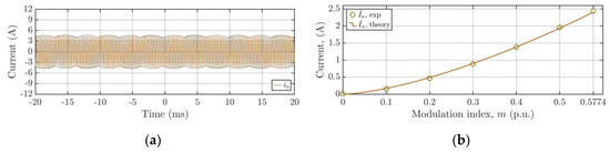 Since the three-phase load is balanced and the modulating scheme is symmetric, neutral wire experiences the ripple component only. Therefore the neutral current depicted in Figure 43a happens to be equal to the neutral current ripple itself. Also for the neutral current, both envelopes (Figure 43a) and rms values (Figure 43b) are validated through experimental results. For the sake of completeness, it should be mentioned that the case of Figure 43 represents a DPWMMAX injection. Nevertheless, as it has been verified that in all the analyzed modulations, neutral current ripple characteristics are injection invariant (balanced modulation only), thus, Figure 43 is valid for the other modulation methods.
