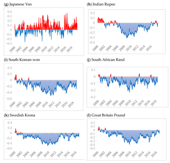 Figure 1 shows the results of dynamic correlation between WTI crude oil and the currency market using the ADCC-GARCH model. Results of the dynamic correlation between WTI oil and FX market highlight negative correlation values, except for the Japanese Yen. According to [10], there may exist many counterbalancing factors that may not allow the exchange rate countries to move in a similar direction with crude oil prices. The findings are also corroborated by the findings of [52], who find negative correlations between oil prices and exchange rates. Further, Indian rupee and Euro also highlight some positive correlation between the 2000–2002 period; however, afterward, it exhibits a negative correlation consistently with WTI crude oil. We also observe that the negative correlation for most of the currencies reaches its maximum values between 2010 and 2014 and then in 2016 except the Japanese Yen. In the case of the Japanese Yen, positive correlation dominates negative correlation and reaches its highest level of 0.3–0.4 across the sampling period. Such a positive correlation between Japanese Yen and crude oil can be a result of Japan being a high importer of crude oil [15]. These results are also highlighted in Table 2 under the safe-haven and hedging of the oil, where the Japanese Yen remains the only currency with which WTI crude oil exhibits neither hedging nor safe-haven properties. Therefore, a clear distinction between the weak and strong safe haven or hedging properties of oil with different currencies can help in protecting investors in gaining optimal returns.