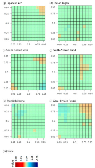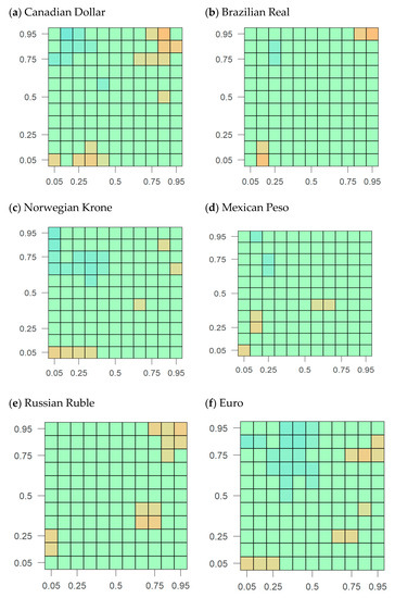 Following [59], we use critical values using a stationary bootstrap procedure for constructing the pseudo samples from blocks of data with random block length (see [60,61] for expected block size). In our study, we test dependence between all quantile pairs given by {0.05, 0.10, …, 0.95}. In this way, we calculate 361 dependence measures for each pair of a given time series with associated p values. To handle the issue of multiple hypotheses, we use Bonferroni correction for adjusting the significance level, thereby leading to a significance level of 0.00013 (0.05/361 = 0.0001385).