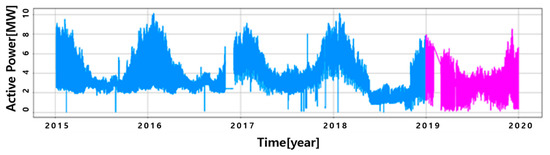 Normal state presumed reference data was created by machine learning model using the pre-processed data. Various predictive models may be applied to predicting time series data, based on machine learning, but they should be models that can properly reflect the characteristics of time series data. Time series load data is characterized by repeated increases and decreases depending on electric usage. The following Figure 2 illustrates the load of Cheongsong D/L for a period of four years from 2015 to 2019. As shown in the figure, the load varies with the electric usage over time, and the overall trend varies from quarter to year, as well. In addition, it should be able to cope with changes in overall load variations, such as one in 2018 described in the figure. If a machine learning model, such as general RNN is applied, it is highly likely that the forecast will be reduced, as shown in the figure with the premise that the load reduction will continue in the future, as shown in 2018. This is because the model is not allowed to set specific weight of the historical data separately, and is designed to reflect a higher importance of the recent data.