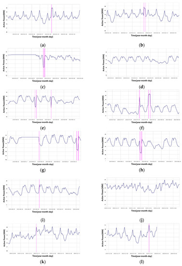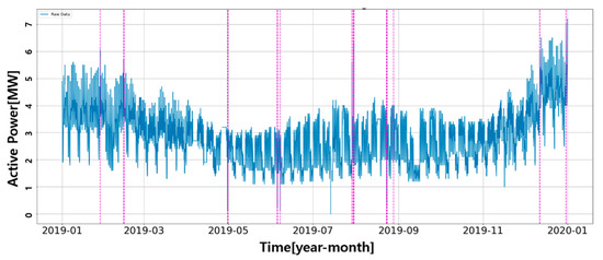 As previously mentioned, machine learning-based load transfer detection is a method used for detection by considering the predicted load as a normal state reference, and comparing it with actual measured load. Therefore, it is important to accurately predict the reference load, and thus, it is important to secure high quality learning data through adequate pre-processing. In this study, the pre-processing of commonly applied missing, zero, and repetitive data was performed. Missing data refers to the data which has not been collected abnormally. Zero data means that the load on the distribution line literally represents zero, and as all actual load cannot be eliminated, it can be considered abnormal data. The repetitive data, which was received same load value for over several hours, can also be determined as abnormal data when considering the nature of load fluctuating on the distribution line. In general, detected abnormal data can be excluded from learning data or be replaced through correction. Although data correction can be applied with interpolation methods using the arithmetic mean, the most frequent value, the maximum, and the minimum, it is difficult to replace data based on these interpolation methods if abnormal data persists for a long time. Even if alternative data is created through other methods, it can affect the reliability of the data, which can eventually reduce the accuracy of load transfer detection [20,21,22,23]. In this study, excluding abnormal data from learning data was used to detect abnormal data.