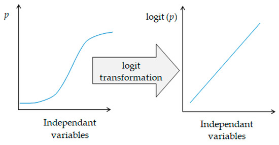 By logit transformation (illustrated in Figure 1) we go from non-linear to linear dependence (i.e., the relation between the logarithm of the odds ratio) and the vector of the explanatory variables acquires a linear character and the equation of the logarithmic model has the form according to: