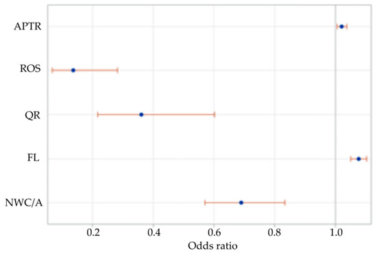 For the continuous variable x with the slope, the exp (B) value can be interpreted as a relative positive likelihood ratio for an enterprise with an x + 1 value to a positive likelihood ratio for an x-value enterprise. Odds Ratio is a positive number, if greater than 1, then the likelihood of the event happening increases; if less than 1, then decreases. Odds ratio (eB) means that if, for example, the independent variable x1 (Accounts payable turnover ratio) is increased by one-unit, then the estimated bankruptcy odds at the other fixed predictors is increased by a multiple of e0.0218 = 1.022. Therefore, if x1 increases by one-unit, the odds ratio is 1.022 times greater. We display odds ratios with 95% Wald confidence limits in Figure 2.