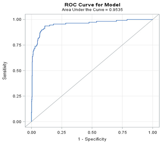 Model discrimination can be judged by the area under the ROC curve, which indicates the likelihood that a bankrupt company has a higher predicted bankruptcy likelihood than a company that is not bankrupt. Curves must pass through points (0,0) and (1,1). The smallest cut-off point is the minimum observed test value minus 1 and the highest cut-off point is the maximum observed test value plus 1. All other cut-off values are the averages of two consecutive ordered observed test values. The ROC curve for the model (Table 6 and Figure 3) defines an area under a curve equal to 0.954. The likelihood that a company in a crisis has a higher predicted probability than a company that is not in crisis is; therefore, 0.954. The 0.9–1.0 interval for AUC and model quality is excellent. The area under the curve (AUC) is a popular criterion for evaluating the correctness of the proposed logistic model. Most programs choose a model based on the largest AUC.