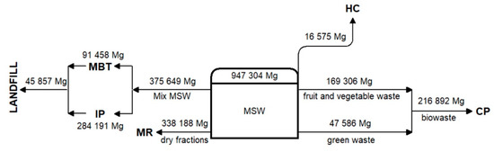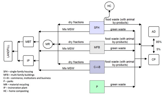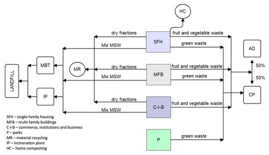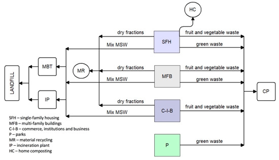 The proposed investigation considered three Technical Scenarios (TSs) for Municipal Solid Waste Management. For each of them, using the Material Flow Analysis method [61], the waste flow was calculated for the period from 2020 to 2050, with a 5-year step. All the scenarios include home composting in some single-family housing (as a measure to prevent waste generation); separate biowaste collection from households in single- and multi-family buildings; from commerce, institutions and business; as well as separate collection of green waste from parks. Separate collection scenarios are described in Section 2.2.