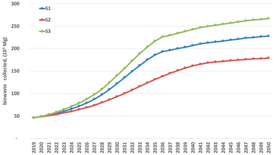 An analysis of the three scenarios of separate biowaste collection presented in Figure 5. indicates that over the first 5 years the differences in the mass of the OFMSW collected are slight, that only after 2025 do the first differences in capture rate appear between the scenarios implemented and that after 2030 it can be clearly seen that scenario S2 strongly differs in terms of the development pace from scenarios S1 and S3. In subsequent years, this difference grows, although the growth rate of separate collection halts for each of them.