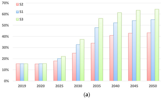 The data for Europe as cited by Corrado and Sala indicate food wastage (in the entire supply chain) in the range from 158 to 298 kg/inh. [9]. The data on food waste arising only in households indicate that it is generated e.g., at a rate of about 76.1 kg/inh. in Greece and that of 68.04 kg/inh. in Hungary. Higher food waste levels arising in households can be found in the report [67], which states that 113 kg/inh. is generated in Europe, while the quantity in Poland is 112 kg/inh. The same report states that the total generation rate of biowaste in Poland is 247 kg/inh. Because the collection of green waste in Warsaw was already at a high level of 78.5% in 2018, the development of scenarios of biowaste separate collection in general will be determined by the development of food waste collection. In the analogous years in scenario S2, the following values will be achieved, respectively: 26.9 kg/inh. (2020), 51.2 kg/inh. (2030), and 99.4 kg/inh. (2050); while in scenario S3 they will be: 27.5 kg/inh. (2020), 76.9 kg/inh. (2030), and 148.1 kg/inh. (2050). For example, in Germany in 2016, 148 kg/inh. of OFMSW was collected, of which over 93% was green waste. According to statistics, the capture rate of green waste in Germany is 78% and of food waste 56%. The highest collection rates, reaching a total biowaste capture rate of between 70–85%, are reported for selected cities and regions: Parma (Italy), Gratz (Austria) and Lubljana (Slovenia) [51]. The average collection level of biowaste in the EU is about 50 kg/inh. [68].