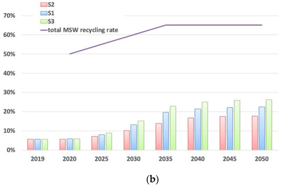 Figure 6 presents biowaste recycling rates in successive years and the share of biowaste in the overall MSW recycling rates. It can be seen that only scenario S3 will make it possible to achieve a recycling rate of more than 50% for the separately collected OFMSW in 2035, while in scenario S2 it will be slightly more than 30%. The rate achieved in scenario S3 will make it possible to achieve 22% from the biowaste fractions towards the required 65% recycling target for total MSW.
