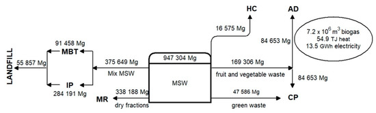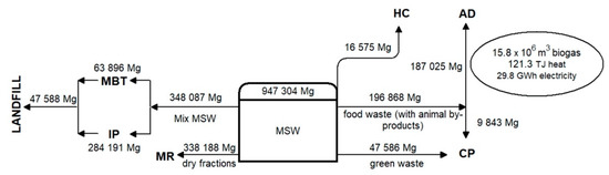 Table 6 presents the flow of waste, which will be intended for AD and CP and the recycling rates achieved for total MSW.