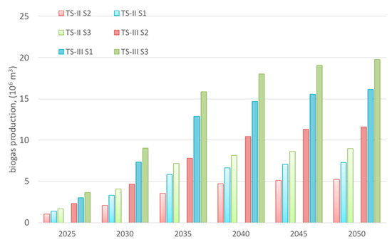 Biogas potential prediction until 2050 under scenarios TS-II and TS-III.