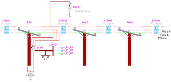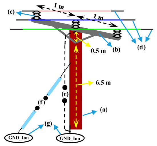 The insulators, which are located between the conductors (overhead lines) and cross arm—see Figure 2c—are modeled by considering a parallel resistor-capacitor circuit, where the values of capacitance and resistance are set to 80 pF and 25 M, respectively [22].