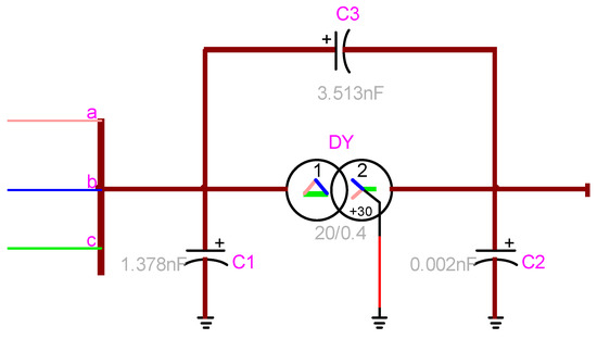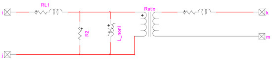 In this work, a delta–star () 22/0.4 kV transformer is modeled in the EMTP-RV environment, according to Cigre Guidelines [44]. Figure 4 shows the basic building block of a transformer for one phase in EMTP-RV, while Figure 5 presents the 3-phase transformer model in which the capacitances on the primary side, between the primary and secondary sides, and on the secondary side have been considered, which play a crucial role in high voltage transient studies.