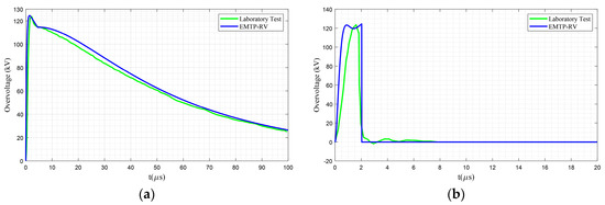 In order to validate the proper functionality of this spark gap, a nonstandard 125 kV overvoltage impulse is used. In Figure 8a, the green curve shows the applied impulse in a laboratory, while the blue curve stands for the applied impulse modeled in EMTP-RV.