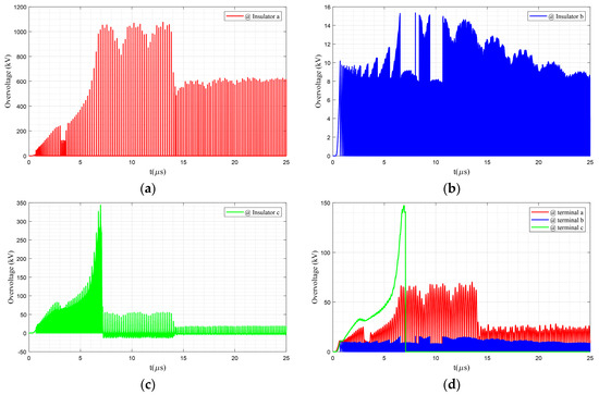 Whenever the voltage across the insulator is larger than the flashover voltage calculated by (1), a flashover occurs. That is, under very high overvoltage conditions, an insulator may experience frequent flashovers. Let us investigate different situations for the insulator and see its performance. To do so, the lightning is applied on phase a (see Figure 6) of an intermediate pole adjacent to the transformer pole. Figure 9a–c present the flashover occurrence across the insulators corresponding to phase a, b and c, respectively, while Figure 9d demonstrates the performance of the spark gap in protecting a pole-mounted transformer against lightning impulses. In these figures, the gaps among the bar-like overvoltages stand for the flashover occurrence, and a larger gap means a longer flashover time. Figure 9a–c shows that, by striking the lightning at a pole, frequent flashovers occur across the insulators, and the highest flashover voltage occurs across insulator a (i.e., insulator used for phase a), which is the phase that the lightning strikes. However, from Figure 9d, it can be seen that, for this phase, the spark gap is not triggered. This happens since the time of each flashover across insulator a is comparatively high (see the gaps in Figure 9a); then, the area under the overvoltage curve (which represents the integral part in Equation (4)) is not large enough to trigger the spark gap (see the red bar-like overvoltage waveform in Figure 9d). For phase 2, the spark gap is not triggered since the flashover voltage is always below the onset voltage of primary ionization, which is 112 kV in this paper—see the blue waveform in Figure 9d. However, for insulator c, the situation is different, and the area below the overvoltage curve is large enough to trigger the spark gap and protect the transformer against very high overvoltage stress.