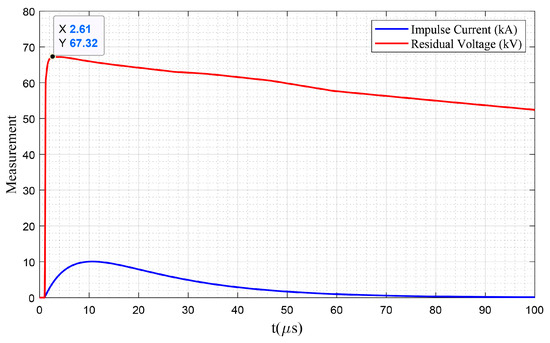 The functionality of the utilized surge arrester can be verified by applying the direct lightning and monitoring the residual voltage under the nominal current. The surge arrester model is validated by performing a simulation-based test under the standard 10 kA current impulse (8/20 μs) and comparing the results with laboratory tests, provided in [43]. The obtained result from the simulated model in EMTP-RV shows a residual voltage of 67.32 kV, see Figure 10, which is in resounding agreement with the 67.5 kV residual voltage reported in [43].