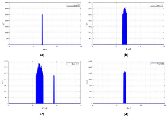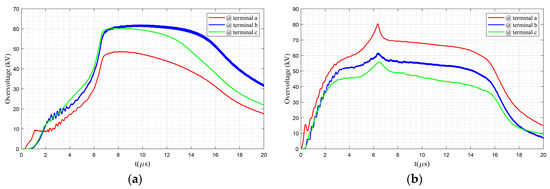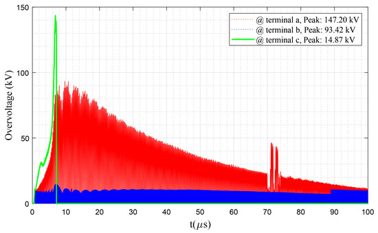 Now, let us consider the performance of surge arresters in the sample network. To do so, first, direct lightning is applied on the intermediate pole adjacent to the transformer pole (see Figure 11a), and then direct lightning is applied on the transformer pole (Figure 11b). As can be seen in Figure 11a, the measured overvoltages for all three terminals are below the residual voltage, while, in Figure 11b, when the lightning directly struck the transformer pole, the surge arrester experienced a steep overvoltage with an amplitude of around 80.34 kV. However, immediately, it starts its proper role and the overvoltage is reduced below its residual voltage level, which is a natural behavior of surge arresters against steep lightning strikes [12]. The cases presented in Figure 11a,b verify the proper functionality of surge arresters under normal and critical overvoltage conditions, respectively.
