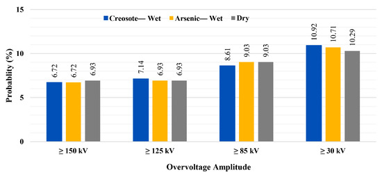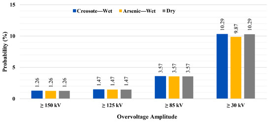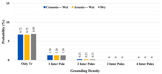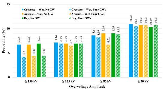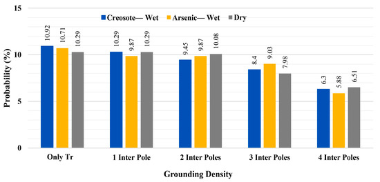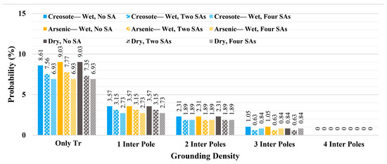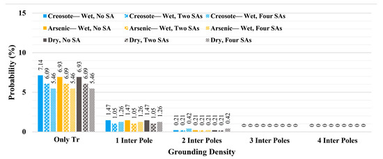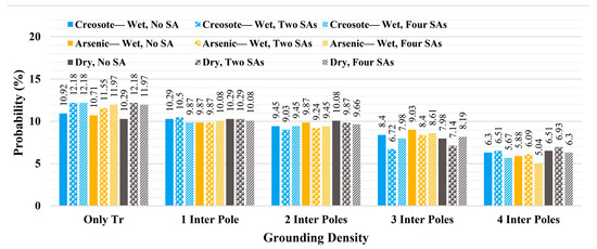 Figure 27 presents the probabilities of transformers experiencing overvoltage stress above 150 kV under different grounding densities. As can be seen from this figure, for the case without grounded intermediate poles (only all transformers (Only Tr) grounded), considering two and four transformer poles results in some mitigation in the overvoltage stress. By protecting two transformers with a surge arrester, both the networks with wet creosote-impregnated poles (blue bars) and dry poles (gray bars) show around a 1.05% decrement in the probabilities of transformers experiencing overvoltage stress, while for the network with wet arsenic-impregnated poles, it results in 0.84% decrement. On the other hand, in this figure, the best performance for all network configurations is obtained when four transformers are equipped with surge arresters where, compared with the scenarios without surge arrester (solid bars), the networks with wet arsenic poles and dry poles show a 1.68% decrement in the probabilities and the network with wet creosote poles shows a 1.47% decrement. Figure 27, compared with the similar overvoltage stress level (above 150 kV) in Figure 23, Figure 24 and Figure 25, shows that considering guy wires for all intermediate poles results in a better outcome than equipping four transformers in the network with surge arresters. Needless to say, and as concluded in case 2, by grounding only one intermediate pole, a great enhancement in the protection level of the transformers is obtained. On the other hand, as can be seen in Figure 27, after grounding one intermediate pole, using surge arresters slightly decreases the probabilities, while grounding two intermediate poles means that the surge arrester does not have a supportive role against direct lightning strikes, and in one scenario (gray diagonal stripes), it negligibly increases the probability of overvoltage stress.
