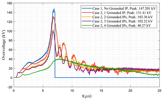 Figure 31 presents a comparison among the overvoltage stress on terminal c of the transformer at pole #36 under different grounding densities for the network with dry poles and considering two surge arrester protected transformers, respectively. By considering two surge arresters, the nearest surge arrester to the transformer pole #36 is placed at pole #26 (see sub-configuration C4.1). From the red curve in Figure 31, which presents the overvoltage waveform under no grounded intermediate pole, it can be seen that the overvoltage amplitude, compared with case 1, is decreased by around 3%, while the spark gap is still triggered. The peak values presented in Figure 31 compared with similar grounding densities in case 2 (see Figure 19) show that the decreases and increases in overvoltage are negligible, and, consequently, if the surge arrester is far from the location of the lightning strike, it might not enhance the network’s protection against lightning overvoltages. On the other hand, a comparison with the results of case 3 (see Figure 26) shows that guy wires are much more effective than the impact of a surge arrester placed far from the lightning strike location.