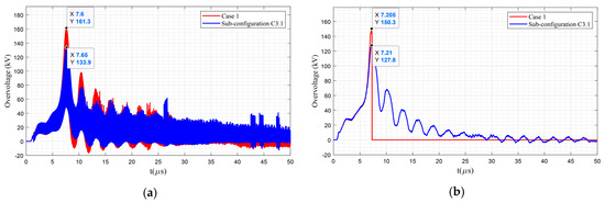 Figure 26 provides a comparison among the overvoltage stress on terminal c of the transformer at pole #36 under different combinations of grounding densities and guy wires of intermediate poles for the network with dry poles. The red curve, which represents the overvoltage waveform for sub-configuration C3.1, compared with case1 (the blue curve), shows that, although considering four guy wires between every two successive transformer poles decreases the amplitude of overvoltage, it is still high enough to trigger the spark gap and cause a service interruption. However, by supporting one intermediate pole with a guy wire in sub-configuration C3.2 (the orange curve), the amplitude of overvoltage is decreased by around 22.8 kV. As a consequence, the spark gap is not triggered, and no service interruption occurs. Additionally, supporting three intermediate poles with guy wires and grounding the other intermediate pole (sub-configuration C3.2), compared with the case with only one grounded intermediate pole (sub-configuration C2.1, the red curve in Figure 19), results in a considerable enhancement in the overvoltage protection against direct lightning, i.e., 11.67 kV decrease in the overvoltage stress. Similarly, by comparing Figure 26 with Figure 19, it can be deduced that other combinations of guy wire and grounded intermediate pole also reduce the overvoltage stress on the transformer terminal.