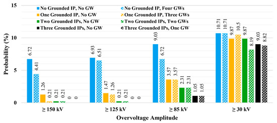 Unlike the three previous overvoltage stress levels, the overvoltage stress above 30 kV shows an unpredictable behavior where considering surge arresters in some scenarios results in increasing the probabilities of transformers experiencing such overvoltage stress. However, this can be justified by considering previous cases. Surge arresters are mainly used to protect the power system equipment against overvoltage phenomena by limiting the overvoltage amplitude or discharging the surge currents associated with surge overvoltages [53]. Therefore, in the sample MV network, these devices are not triggered for overvoltage stress around 30 kV. As a result, and as can be seen in Figure 27, Figure 28 and Figure 29, the surge arrester is triggered for overvoltage levels above 150 kV, 125 kV, and 85 kV, and the amplitude of overvoltage at the MV terminals of some transformers is decreased to a level below 85 kV, which is accumulated as the probability of an overvoltage stress level above 30 kV.