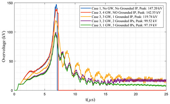 Comparison among the overvoltage stress at terminal c of the transformer mounted at pole #36 under different combinations of grounding and guy wire (GW) configurations of intermediate poles (IP); Network with dry poles considering four surge-arrester-protected transformers under a lightning strike on pole #35.