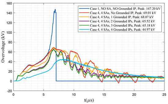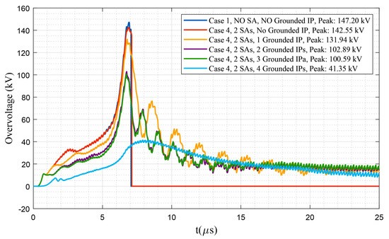 - Considering surge arrester for some transformers. This case investigates the impacts of surge arresters on enhancing the protection level. In this case, two different sub-configurations are performed considering two and four surge-arrester-protected transformers.