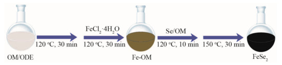 FeSe2 nanoparticles were synthesized under nitrogen using a simple solution-phase method based on a previous report about synthetic procedure and featured uniform sizes and morphologies [58]. The synthesis procedure of FeSe2 is shown in Figure 1. FeCl2·4H2O powder and selenium dissolved in OM were sequentially added to a mixed solution of OM and ODE. During the reaction, the FeCl2·4H2O precursor solution gradually became reddish-yellow. After selenium injection and increasing the temperature to 150 °C, the color of the solution gradually turned black. The reddish yellow solution was the reaction between FeCl2 and OM which can led to formation of a Fe–OM complex while the black solution was formed of putting Se–OM solution into above solution in order to the formation of FeSe2.
