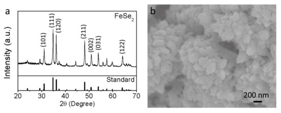 Characterization of FeSe2 nanoparticles. (a) XRD spectrum; (b) SEM image of FeSe2.