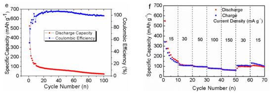 The cycling performances and Coulombic efficiency of FeSe2|Mg2+/Li+|Mg battery are illustrated in Figure 3e. As is seen from the curves, the specific capacities decreased with the increase of cycles. In addition—despite a lower Coulombic efficiency observed in the first and second cycles—the Mg–Li hybrid battery showed a highly reversible behavior during subsequent cycles. The chloride ion was the counter-ion for the lithium salt, which made up a part of APC, and LiCl was expected to be very compatible with APC. The formed APC–LiCl electrolyte was conducive to highly reversible Mg deposition and/or dissolution and afforded a high anodic stability, despite the reaction between LiCl and the complex Mg electrolyte [62]. Low initial Coulombic efficiencies at first may be due to the SEI formation. For comparison, the rate capabilities of the FeSe2|Mg2+/Li+|Mg battery under various current densities are shown in Figure 3f. Raising the current density from 15 mA g−1 to 150 mA g−1, the capacity decreased the increase of current density. This reflected a relatively favorable capability during short cycling. The results showed that the performance of the MLIBs was superior to the traditional rechargeable Mg battery.