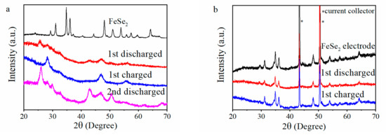 The electrochemical reaction mechanism of the FeSe2 was further investigated by ex situ X-ray diffraction (XRD) test at different discharging/charging states in APC electrolytes with and without LiCl. The results are shown in Figure 4a,b, respectively. In the Li+-containing electrolyte, the “Li+-only intercalation” mechanism at the cathode was confirmed after a comparison of XRD patterns before and after discharging (Figure 4a). After discharging at first time, the Li2Se, Fe and FeSe were detected, it can be attributed to the solid electrolyte interphase (SEI) layers formation resulting from the electrochemically driven electrolyte degradation and the decomposition of FeSe2 (FeSe2 + 2Li+ + 2e− → FeSe + Li2Se, FeSe + 2Li+ + 2e− → Fe + Li2Se) [60,61]. This confirmed that only Li+ reacted with FeSe2 in the mixed-ion electrolyte and was consistent with the CV and charge–discharge curves. However, after charging at first time, the FeSe was detected rather than FeSe2. Which should be ascribed to the formation of the LixFeSe and FeSe (Fe + Li2Se → LixFeSe + (2-x)Li++ (2-x)e−, LixFeSe → FeSe + xLi++ xe−), respectively [60,61]. In the plain APC electrolyte, the FeSe2 structure remained unchanged during the charge–discharge process (Figure 4b).