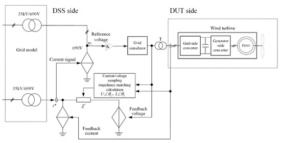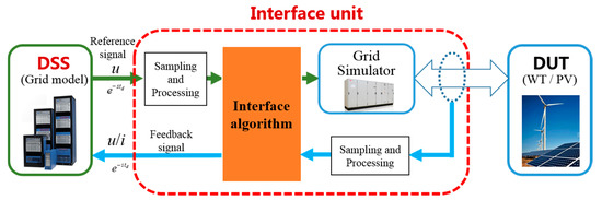 The traditional grid simulator is mainly based on the power electronic converter, which can only simulate some specific grid faults such as high- and low-voltage faults, harmonics and frequency changes, and so on [3]. However, it cannot simulate real-timely actual grid characteristics and the interactive characteristics of the renewable energy and the power grid. Recently, real-time integrated simulation system (RTISS) with renewable energy and the power grid based on power hardware-in-the-loop (PHIL) technology is becoming a hot topic of research in renewable energy areas [4,5,6]. Using PHIL technology, the digital simulation system (DSS) and the device under test (DUT) are connected by an interface unit composed of interface hardware and an interface algorithm to form a close loop RTISS, as shown in Figure 1. The interface algorithm is used for mutual mapping between DSS side and DUT side. The interface hardware, containing a large-capacity power conversion device, introduces interferences and time delays, which have a serious impact on the stability and simulation accuracy of the simulation system [7,8,9]. At a power level on the order of tens of megawatts, the cumulative effect of even small time delays and errors causes severe distortion in the output waveform, which has serious consequences in the integral stable operation of the simulation system. Therefore, designing an appropriate interface algorithm (IA) is crucial to improve the stability and accuracy of the RTISS of renewable energy and the power grid.