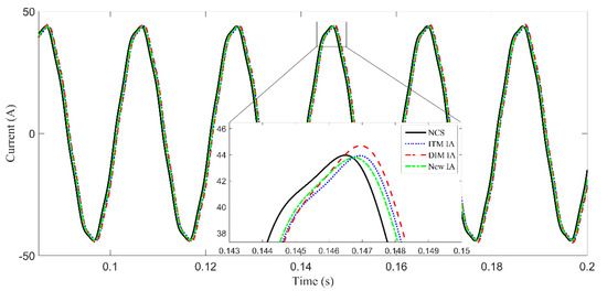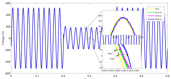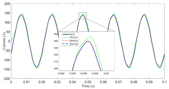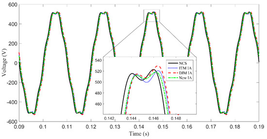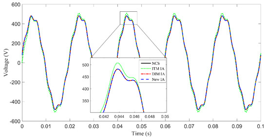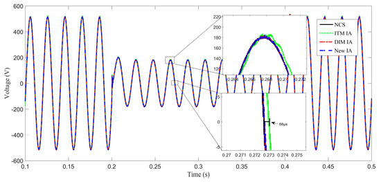 According to the implementation principle and theoretical analysis of the new IA proposed in this paper, using the new IA, the DSS side and DUT side characteristics of the PHIL simulation system should be consistent with the DIM and ITM interface algorithms. We carried out a comparative analysis of the response results of the PHIL simulation system and equivalent original system using three interfaces. Figure 5 and Figure 6 show the voltage and current waveforms of the DSS side, respectively, whereas Figure 7 and Figure 8 show the voltage and current waveforms of the DUT side, respectively.
