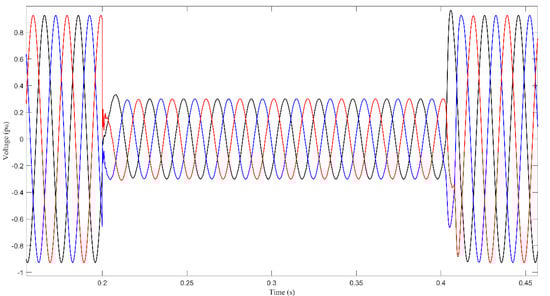 A three-phase symmetrical short-circuit fault occurs at the 35-kV bus of the far end of the WT, where the short-circuit resistance is 10 Ω. Figure 10 shows the voltage drop waveform of the 35-kV bus.
